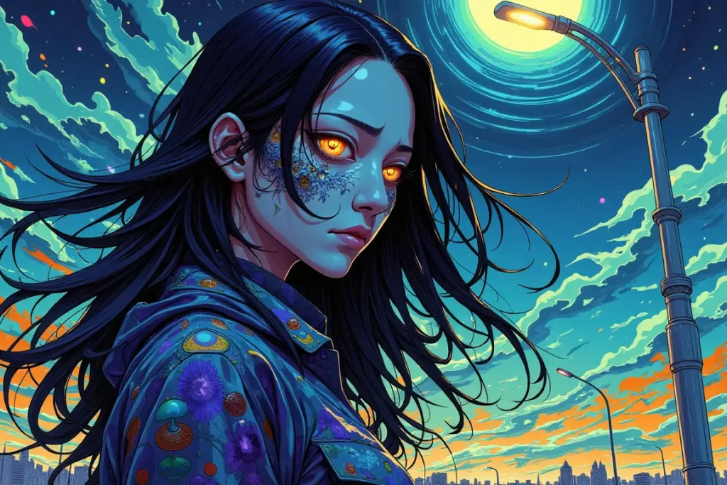她就静静地站在那里,站在公交车站边的路灯底下。明亮的灯光照耀着她洁白却略带忧愁的脸庞,微风轻拂她黑里透棕的柔顺长发。不须交谈,我就能感受到她浑身萦绕的知性美。仅仅是这寥寥数眼,我的心就被她轻易地俘获了。我沉醉于那姣好的容颜之中,沉醉在那独特的气质之中。对那时的我而言,整个世界突然变作了被水浸泡过的油画,模糊而不真实。夜空与喧哗的城市交融在了一起,混出了别样的颜色。而在这光怪陆离的世界中心,那高挑而不失优雅的身影始终屹立着,像一盏万古不灭的启明灯。