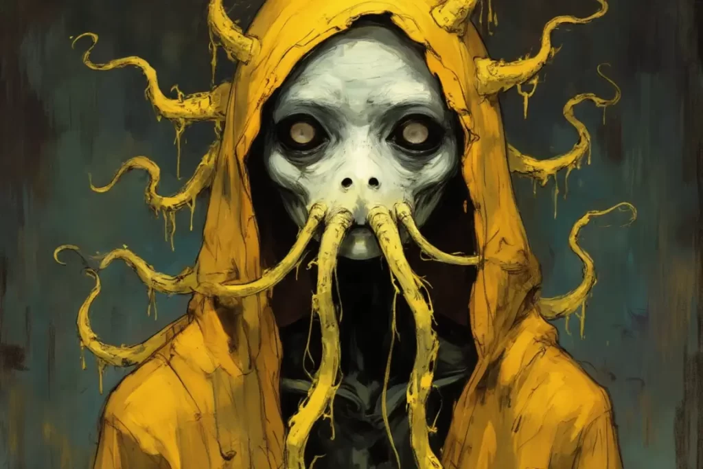 那瘦骨嶙峋的身体隐于褴褛的黄衣之下,苍白柔软的奇异面具遮掩了祂的面容。浑黄的龙须在其下颌扭曲地生长,在空中摆动着,仿佛拨弄着天地间的罡风,其形态恰如八爪鱼之触须拨弄水流。那素白的面具看似光滑,又似乎能看见掩于面具之下的那来自远古的龙颜之貌。面具上只开出了两眼的位置,两个孔洞处一片漆黑。那漆黑是如此深邃,仿佛能容尽天河之水而不满溢。随着那褴褛黄衣飘动,更有千百条龙须间或露出、伸展,仿佛那黄衣笼罩之下的并非常人之形,是更为悠远古老的神圣异象。