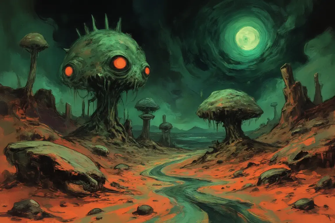 由于语言完全不通,沟通只能依赖简单的手势与比划,不过这些并不影响土著们的淳朴与热情,他们拿出风干的肉类与淡水来招待这群不速之客,又通过笨拙的手势向队员们示意一些在沙漠中注意事项,其中大多数内容分都属老生常谈,不过最后一条吸引了队员们的注意:一位土著拿出一片绿色的布料,放在地上,然后指了指布料,表情突然变得狰狞,他把双手伸成爪子的样子,做出撕扯的动作,口中发出低吼,旁边的几位土著全部露出了惊恐的表情,有人甚至用手遮住眼睛,缓缓后退。