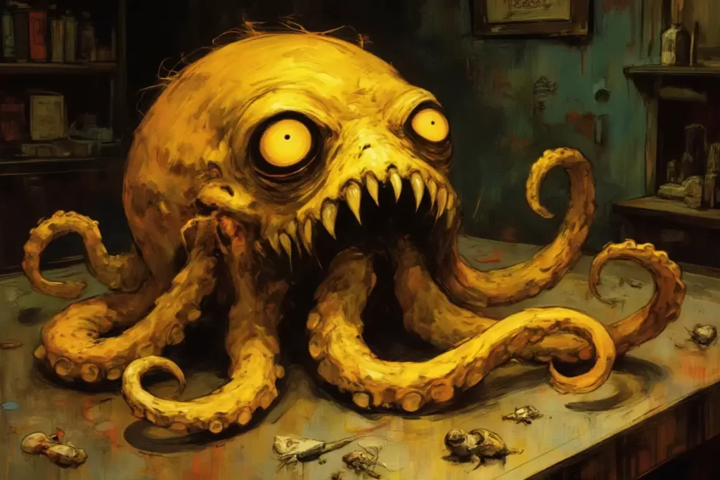县令拗不过夫人,解开布囊的封口,将里面的东西倒了出来,一团金色的触手滚落在桌案上,软绵绵、黏糊糊,摇摇摆摆,就像一个活物一样。桌案上的刀笔简牍,刹那之间就被触手吞没,那触手似乎又大了一点;县令和夫人耳中仿佛听到一个孩子哭泣着叫道:“与我饱,死无怨也……”