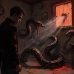 可是,当我走进塔顶的房间时,却望见犄角般的亏月正放出鲜红的、不祥的光芒。这摇荡的光芒穿透了沉淀在遥远的巴诺夫 (Banof) 山谷中的雾气,而苍白的北极星却在天花板的缺口处闪烁着,它的脉动就像拥有生命,它的凝视就像恶鬼或魔王的眼睛。北极星的魂魄向我低语着邪恶的言辞,富有节奏地重复着可恶的约定,引诱我进入叛国的安眠: